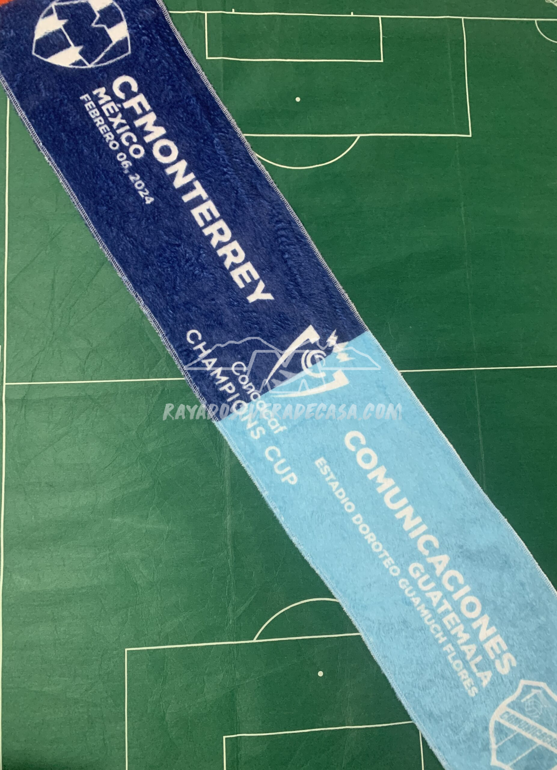 Bufanda de Rayados vs Comunicaciones de Guatemala 100cm por 17cm aproximadamente, con costura en el contorno. Bufanda de aquella ronda de CONCACAF en la que ganamos la ida (dentro y fuera de la cancha) 1-4 y concluimos en la vuelta con un 3-0.
