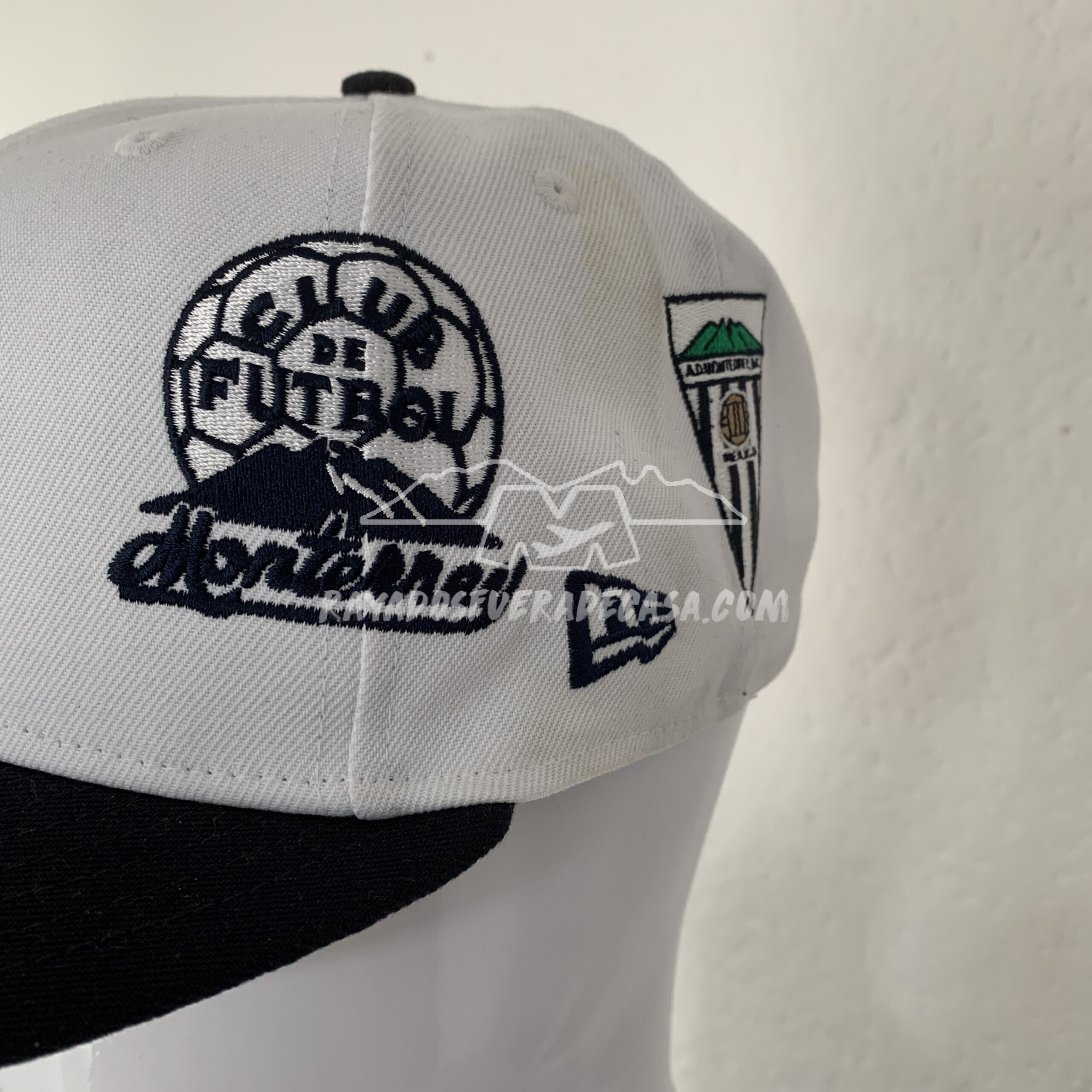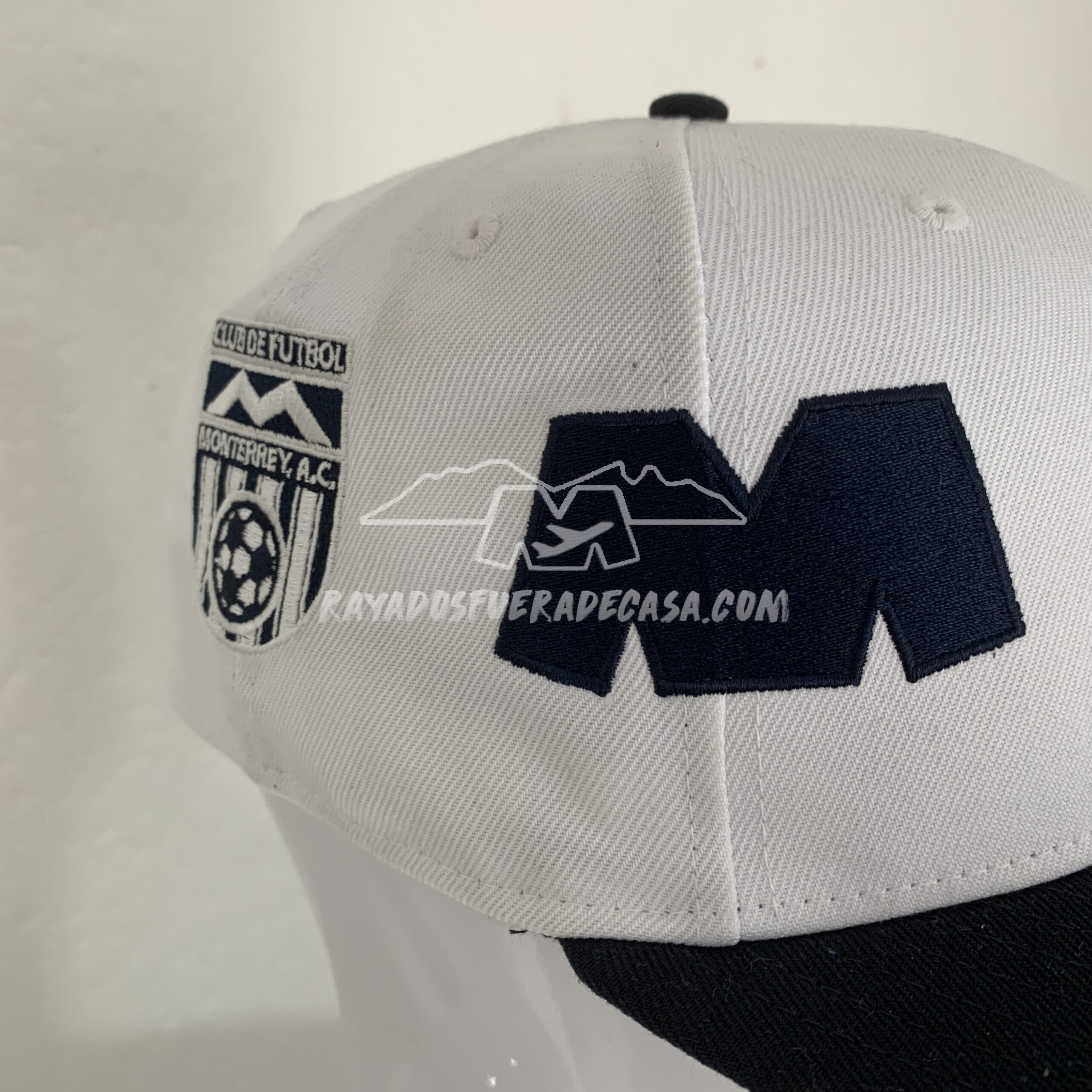 Gorra azul con blanco, con escudos bordados, cerrada, visera plana 100% poliester, visera inferior 100% algodón.