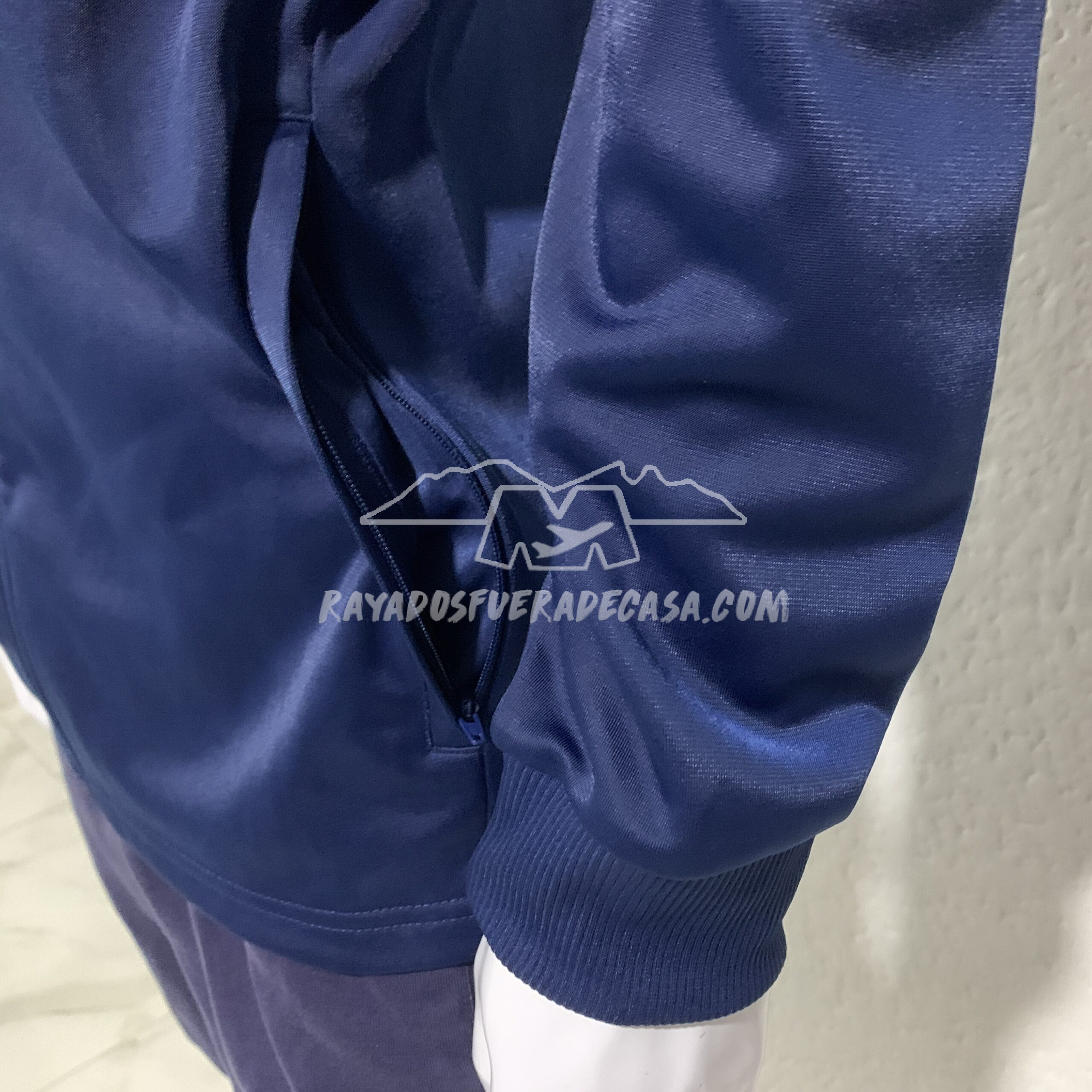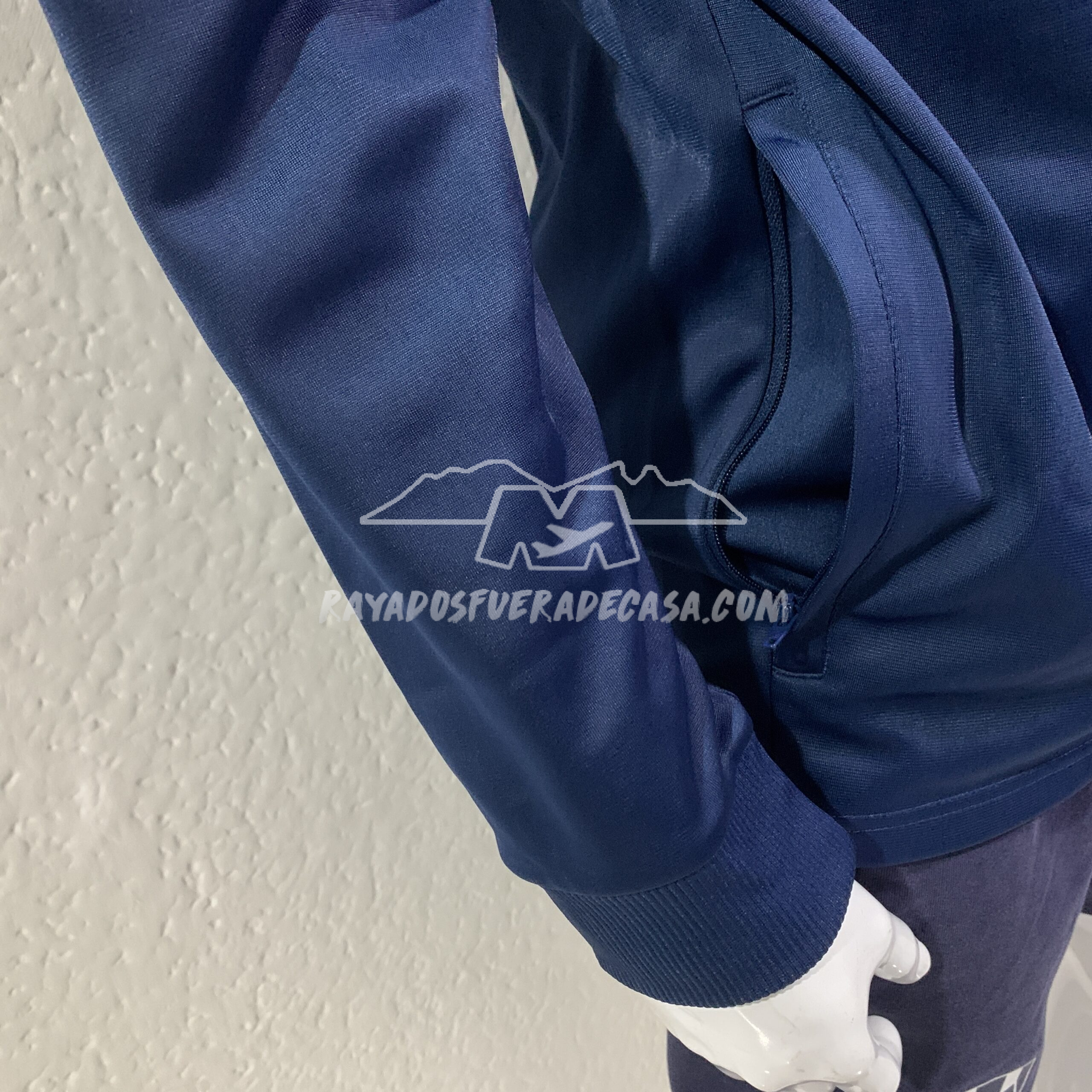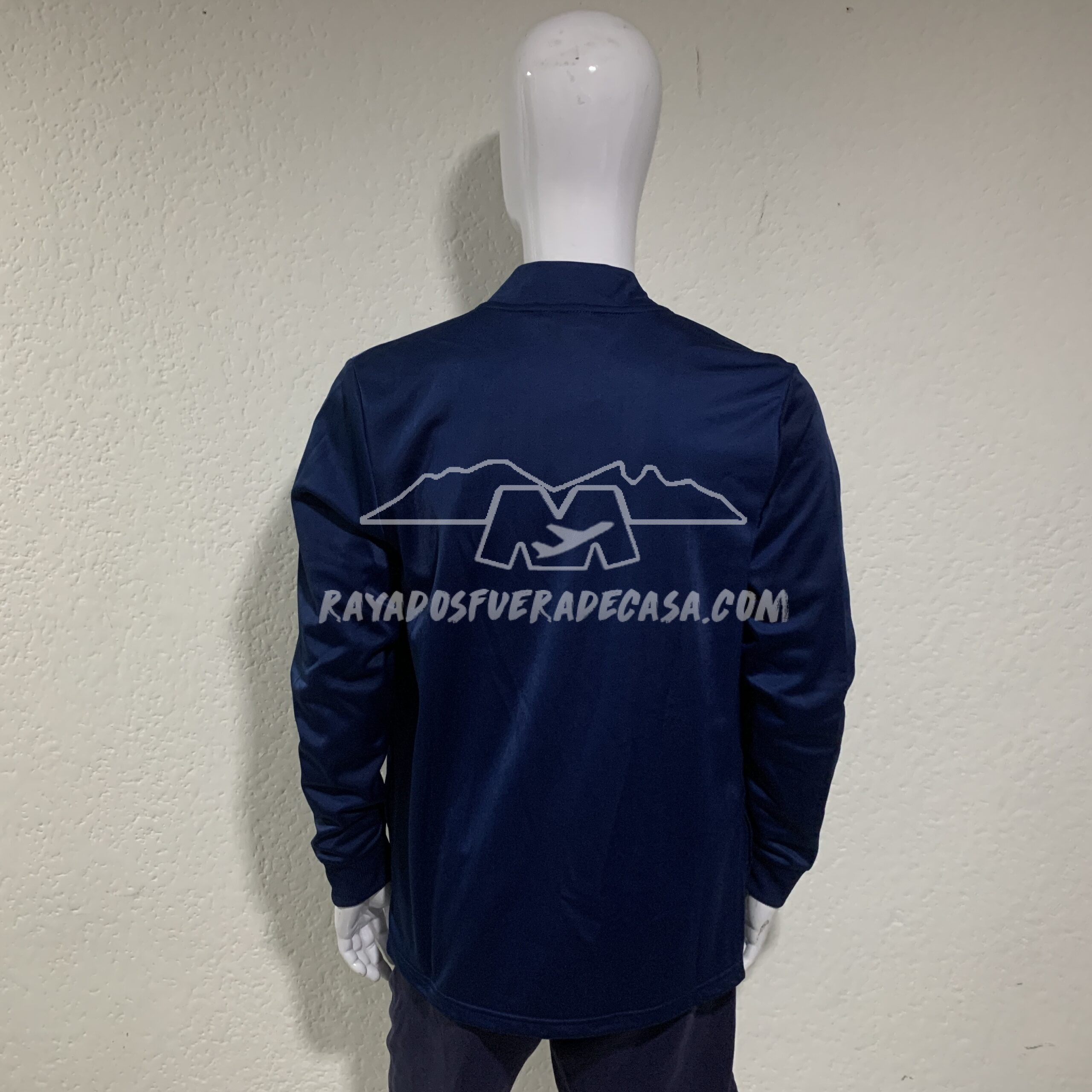 Jacket de cierre completo y cierres en las bolsas a los costados, escudo y logo estampados, ligero, con vivo color azul y letras “M” alrededor del escudo.