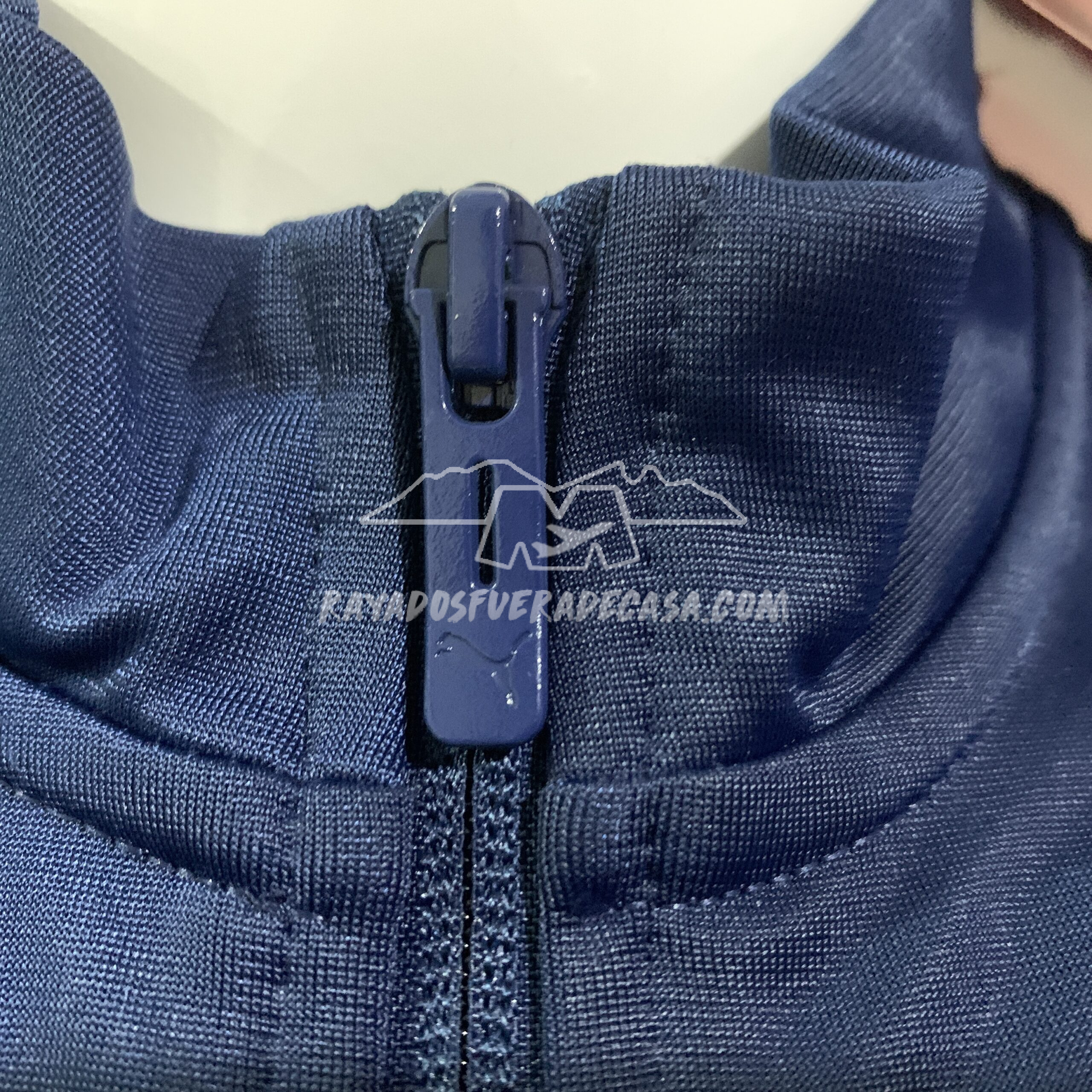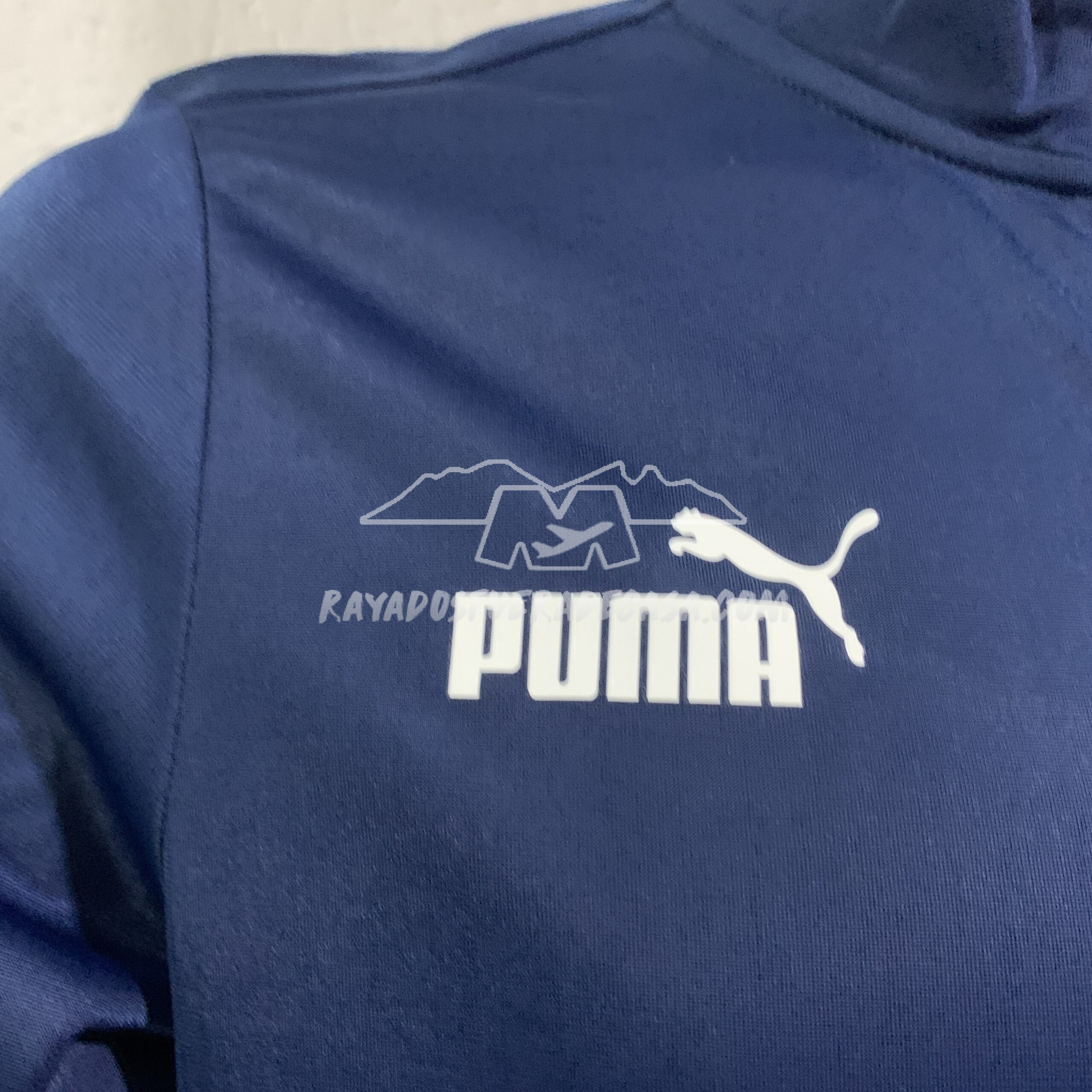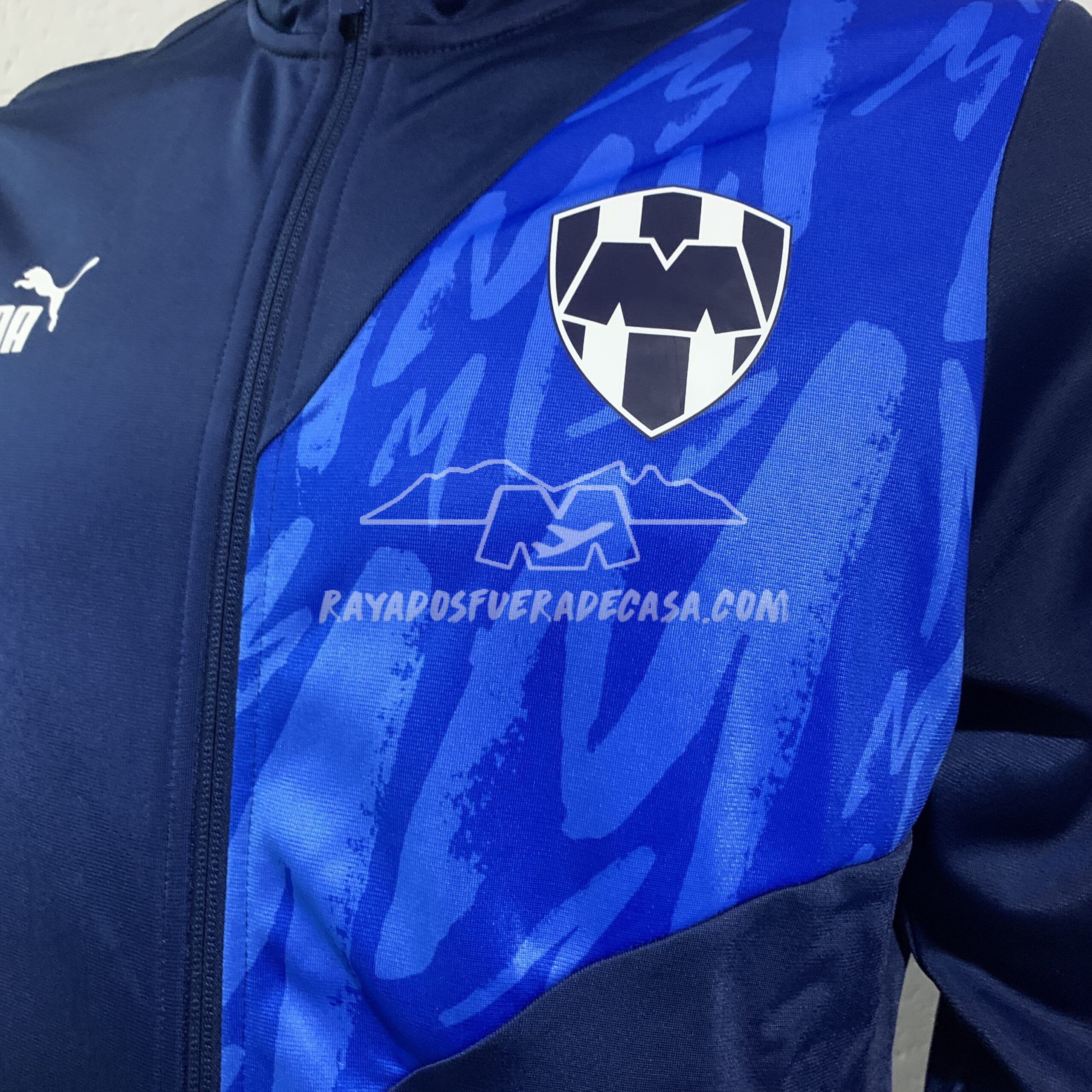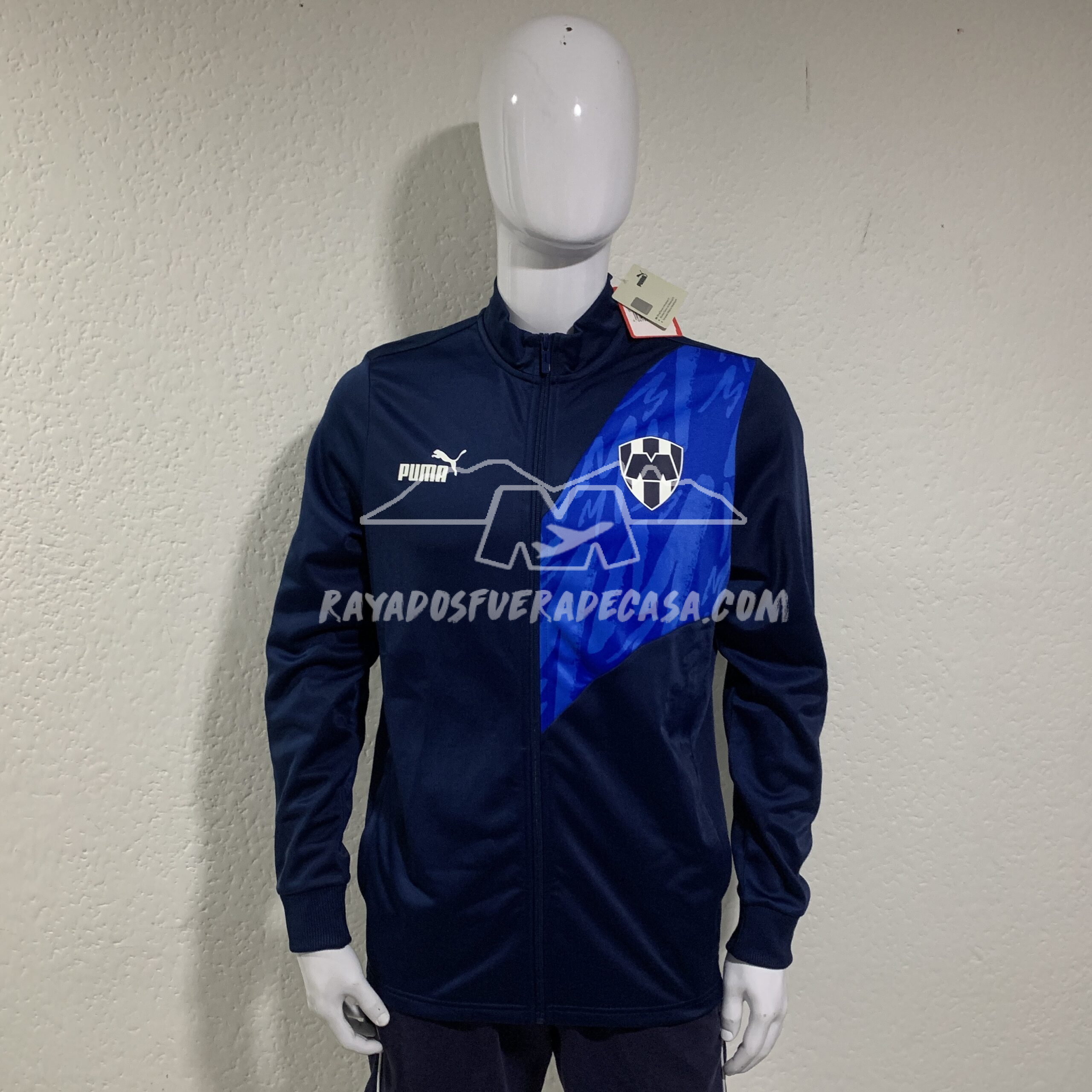 Jacket de cierre completo y cierres en las bolsas a los costados, escudo y logo estampados, ligero, con vivo color azul y letras “M” alrededor del escudo.