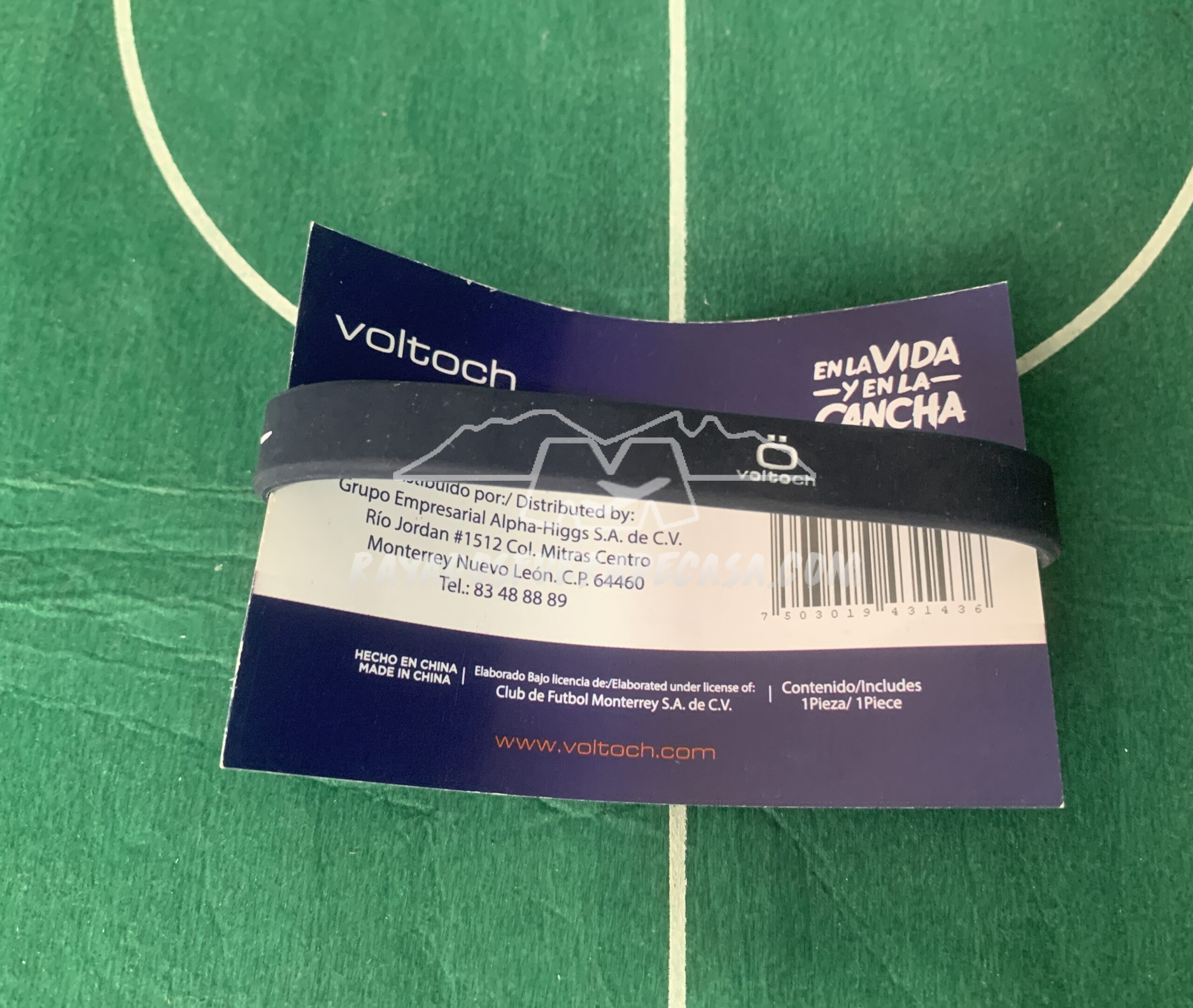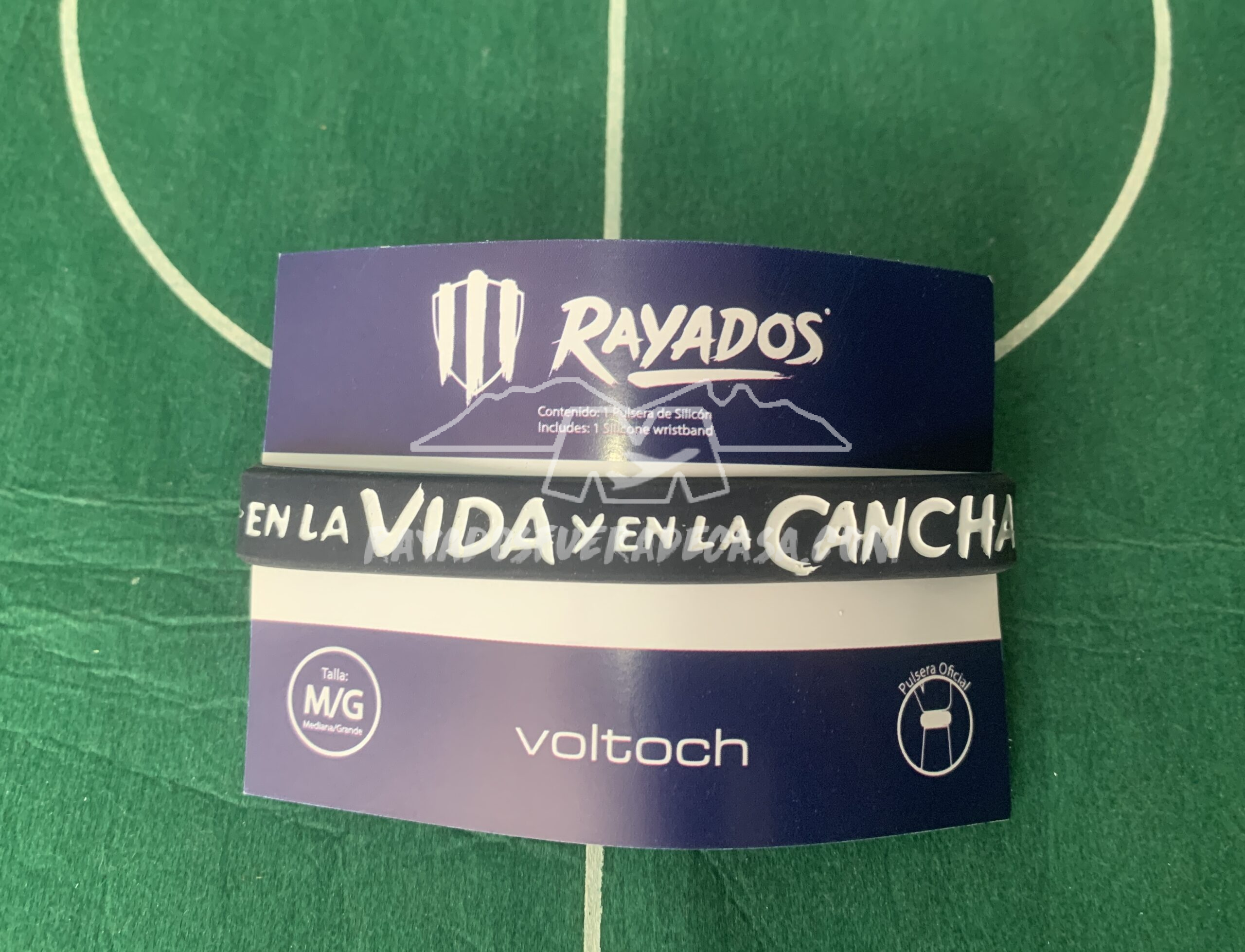 Pulsera de silicón con la leyenda “EN LA VIDA Y EN LA CANCHA”.